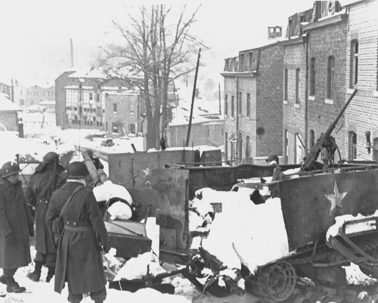 However, during the night of December 17-18, 1944 at the Battle of the Bulge, a company of the 526th Armored Infantry Battalion, without CDL tanks, under the command of Maj Paul J. Solis, with a platoon of towed three-inch tank destroyers was sent to Stavelot, Belgium, where the head of Obersturmbannfuhrer (Lt Col Waffen-SS) Jochen Peiper’s column lay. Just before daybreak, Maj Solis began moving his unit into position, placing two platoons on the south bank of the Ambieve River, a section of tank destroyers at the old roadblock, and one platoon with three 57-MM antitank guns and the second section of tank destroyers in reserve around the town square north of the Ambieve River. Before his troops were completely organized, the Nazi infantry attacked.