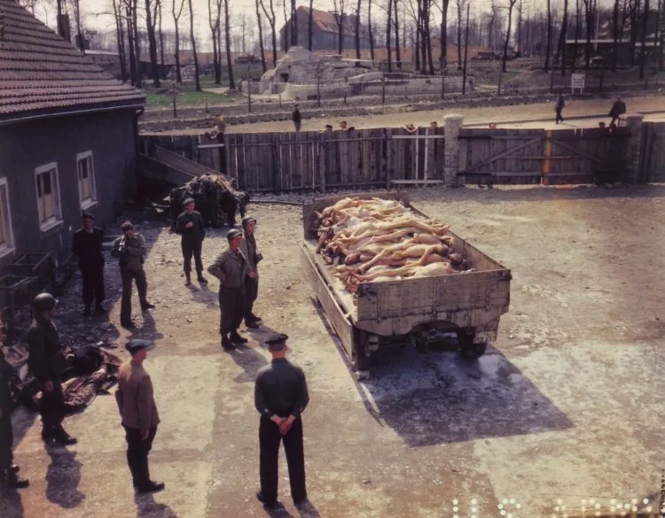 Two American soldiers standing in front of the trailer loaded with corpses in the courtyard of the crematorium. In the background a liberated inmate.
