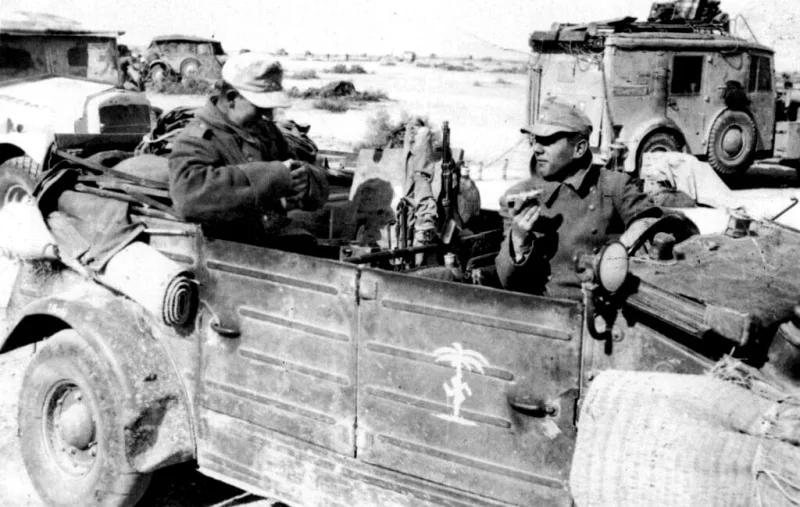 Soldiers eating rations in their Kubelwagon. Note the palm tree with swastika stencil on the door