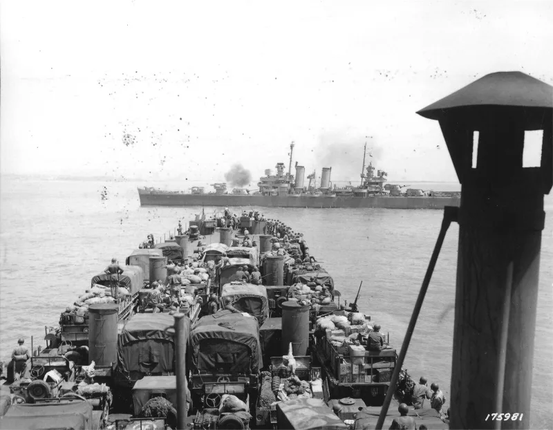 2-AD-EUCMH-Operation Husky-Sicily-1943-USS Boise engaging enemy armor as LST-325, with its load of US Army vehicles, approaches the landing beaches near Gela, Sicily, 11 Jul 1943