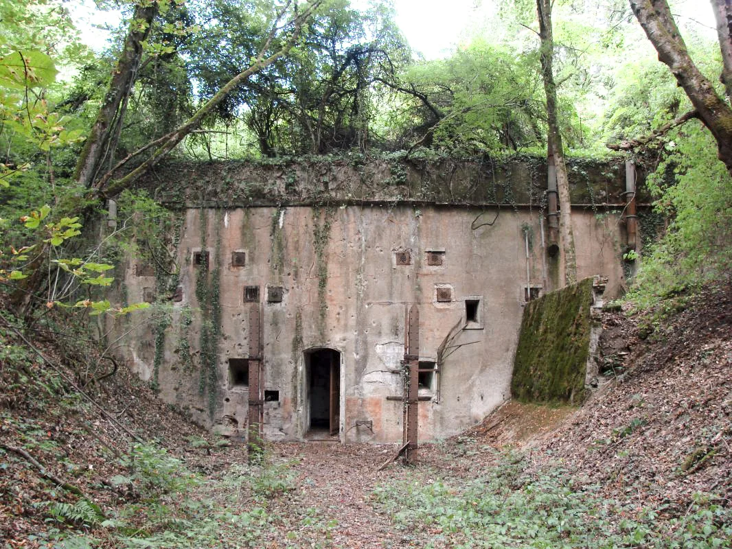 (Wikipedia) The Fortifications of Metz, a city in northeastern France, are extensive, due to the city’s strategic position near the border of France and Germany. After the Franco-Prussian War of 1870, the area was annexed by the newly created German Empire in 1871 by the Treaty of Frankfurt and became a Reichsland. The German Army decided to build a fortress line from Mulhouse to Luxembourg to protect their new territories. The centerpiece of this line was the Moselstellung between Metz and Thionville, in Lorraine. The fortifications around Metz consisted of casemates, concrete barracks, infantry strong points, and concrete batteries, equipped with rotating steel turrets (100 or 150 MM). Each position was surrounded by several ditches, or concrete trenches, with shelters and observation cupolas. A large barbed wire belt, defended by machine gun and rifle positions, completed the defensive system. The Forts had usually several large blockhouse-style barracks. These had 3 M thick reinforced concrete roofs with 2 M thick walls. They were partially buried under as much as 6 M (20 ft) of compacted earth. Underground tunnels connected all of the structures. The fort also had deep wide trenches, some as much as 9 M (30 ft) in both dimensions. They were also surrounded by a thick layer of barbed wire entanglements.