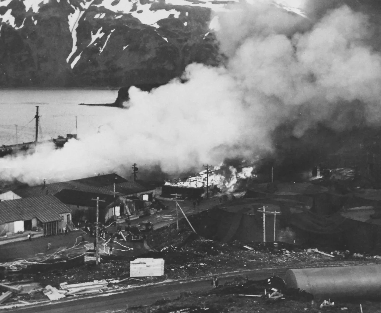 Dutch Harbor, Alaska, June 1942. SS Northwestern and Seims-Drake Warehouse burning after a bomb (Official US Navy Photograph)