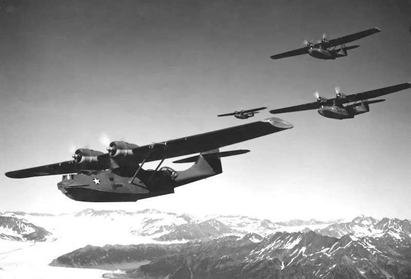 PBY-5 Catalina aircraft in flight over a glacier in the Alaskan coast Aug 22 1942 (43-P-16 VP-43 operated from Nazan Bay, Atka Island)