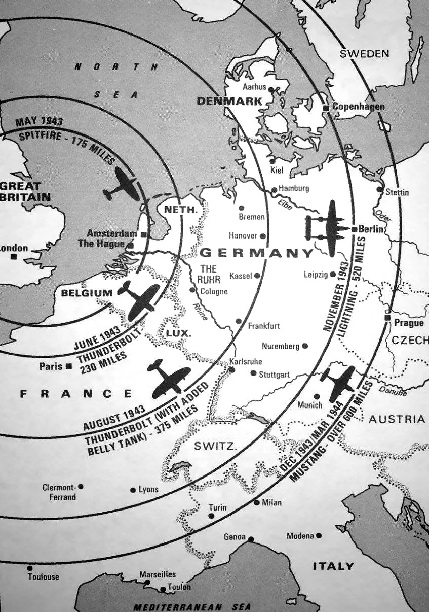 A map of the distance WWII fighters can fly from the UK mainland