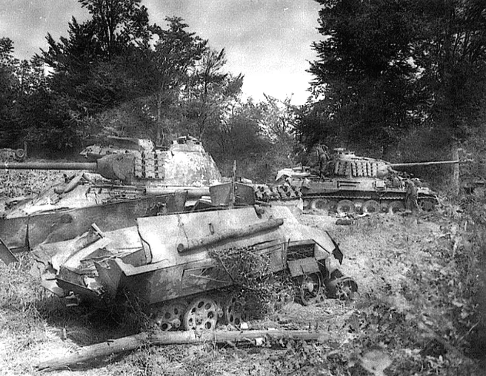 Destroyed armor of 2nd SS ‘Das Reich’ after their failure against the Americans in Mortain France August 1944