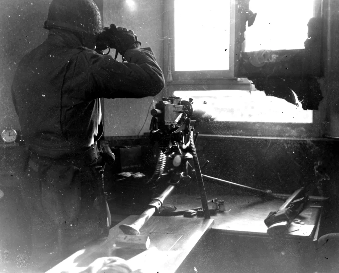 Home Operation Greif (Skorzeny) – Battle of the Bulge (Maj J. Jarkowsky) Pvt. Roy McDaniels, of Hartford City, Indiana, keeping watch for enemy activity from a machine gun position at a 30th Division observation post in Stavelot, Belgium - Battle of the Bulge, December, 1944(scaled)
