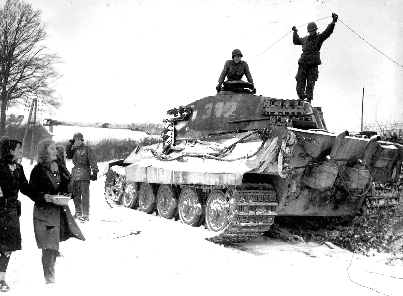 Two American soldiers inspect the abandoned then destroyed German King Tiger #312 tank while villagers look on smiling, Belgium, 1944
