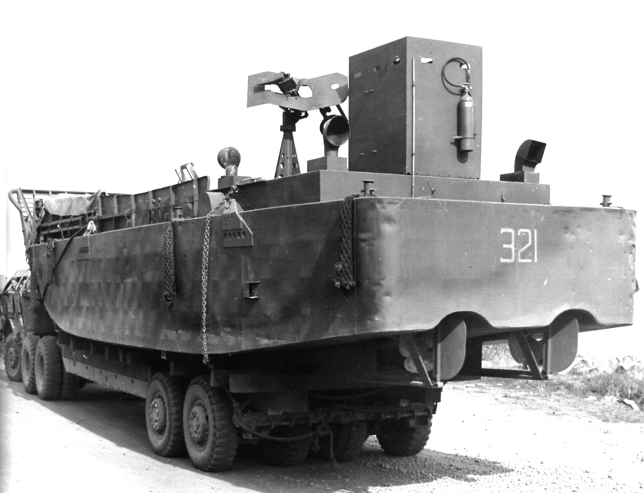 Carrying a Navy LCVP, a U.S. Third Army flatbed truck heads for the Rhine River, March 1945 (NARA)