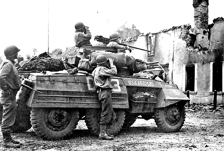 An M8 Light Armored Car is used to conduct reconnaissance during World War II circa 1944