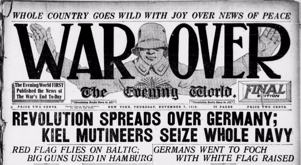 At noon one of our bands was rushed in autos and paraded the streets with a crowd of American and French soldiers following arm in arm, telephone girls, Y.M.C.A. workers, and gaming. This afternoon they brought in one of our colored bands to keep things going. Tonight I have just come into my billet. It seemed odd and cheerful to come through lighted streets instead of stumbling thru the dark as we have had to do heretofore. The lights shone through all the windows and doors. They seem exceptionally bright – it looks like Broadway after the gloom we have been accustomed to. We take over Cologne, Coblenz, and Mainz and bridgeheads extending 30 kilometers from these points. The Boche must hand over 2000 airplanes, 5000 cannons, 30.000 machine guns, 5000 locomotives, 150.000 cars, and 10.000 motor trucks, give up part of his ships and dismantle the rest.