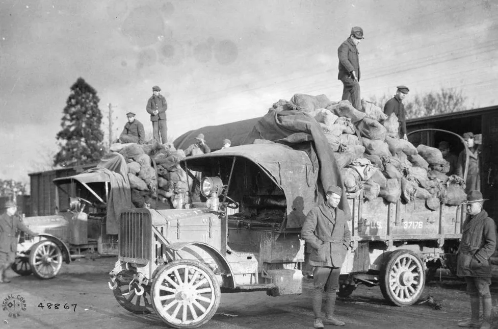 Soldiers unloading clothing and shoes to be repaired at the Quartermaster Corps Salvage Depot in Saone-et-Loire, France