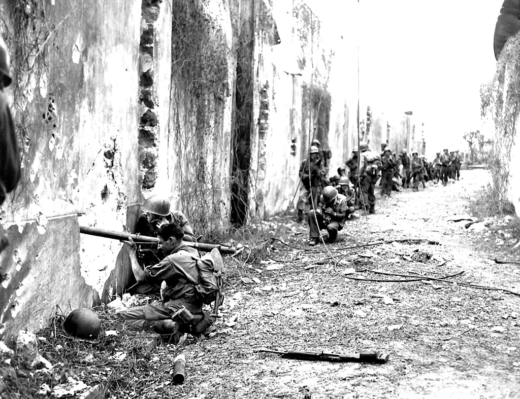 The 1/145-IR was directed to cross the Pasig River in the division reserve. The 2/145-IR which had been relieved of the mission of securing the north bank of the River by a special security force advanced to the northeast to eliminate the gathering resistance in the Tondo area. This growing enemy resistance was threatening the entire XIV Corps supply line. The operation soon developed into fierce house-to-house and street-to-street fighting. The 3/145-IR was busily engaged in the Polo Area blocking the enemy’s route of escape and denying him access to areas adjoining the Corps supply line. The 159-IR less one battalion crossed the River and advanced to the southwest with its right flank hinged on the Pasig and left flank abreast of the 148-IR. All crossings of elements of the division, including the division reserve, were completed by 1655 on February 8. Ground opposition throughout the day was only spasmodic, but shelling by mortar, artillery, and rockets was extremely intense. On February 9, elements of the division had crossed to the south bank of the River, and were well on the way in an enveloping movement to encircle the strong enemy position within Intramuros and make contact with the 1-CAV, which was making a wide envelopment to the southeast and the 11-A/B which was attacking from the south.