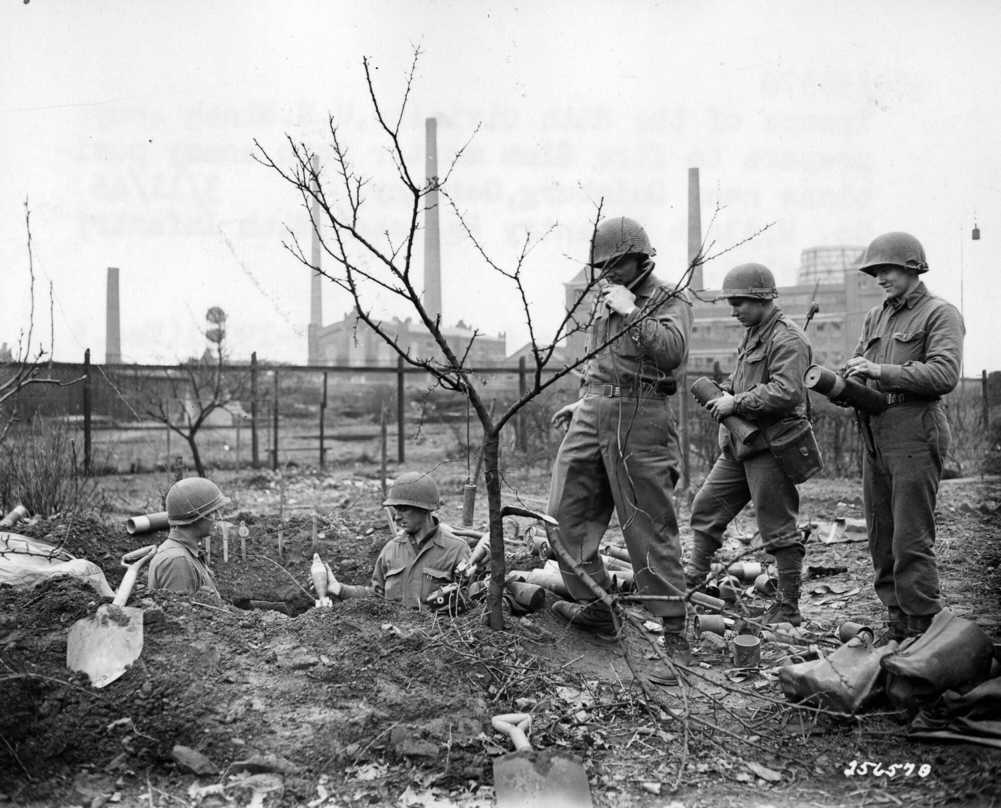 Enemy artillery fire continued heavy. The Artillery Liaison Officer and an officer from Corps Artillery estimated that 6000 rounds of artillery and mortar fire landed on the small bridgehead every 24 hours. For a 24-hour period, the XX Corps Artillery fired 19.404 rounds of counterbattery. Some of the buildings began crumbling from the consistent shell fire. The Battalion Command Post was moved from the large brick buildings south of the road to a German air-raid shelter north of the road. A short time later an enemy artillery shell scored a direct hit in the room previously occupied by the command group. This shell killed several of the Message Center Group who had just occupied the room. The night of December 4, was a repetition of the previous night. The Germans made several attempts to penetrate the left flank of the Battalion but were repulsed each time. On one occasion artillery fire was called for in the woods in front of Baker Co. A few minutes later, a terrific barrage was dropped in the woods and Germans could be heard screaming. The forward observer reported the mission was accomplished and was told that the mission had not been fired. The Germans had shelled their own troops.