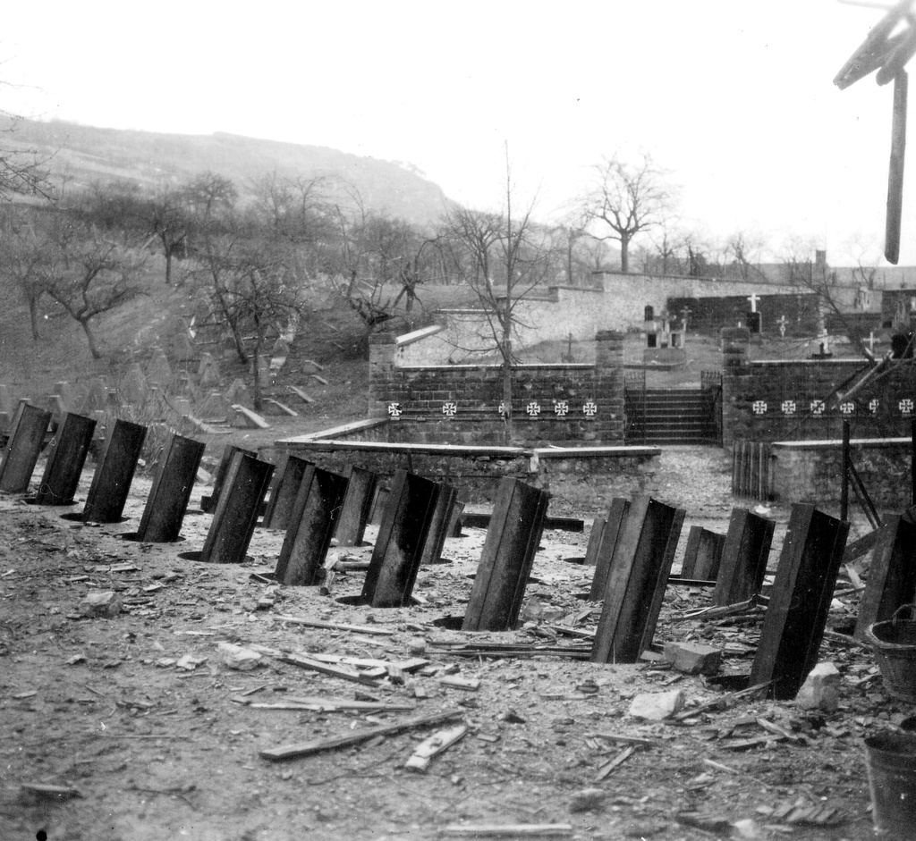 It was then decided to make a second attempt to envelop the position from the left flank, to be preceded by a 10-minute barrage from all available artillery in the corps. Smoke would be used to screen Able Co’s left flank from enemy observation as it crossed the open ground. In the event that the infantry could not keep up with the supporting tanks, the tanks were to continue on alone to the objective, Weisenberg. Able Co was forming on the line of departure as the heavy preparation began. However, many rounds of friendly artillery appeared to be falling short of the target, in fact, the concentration searched back toward our line of departure to the extent that Able Co was forced to withdraw to covered positions minimizing casualties from overhead tree bursts. After a 30-minute delay to permit registering on the target by all forward observers, the concentration was repeated. Again tree bursts forced the infantry to take cover. The tanks, however, jumped off according to plan and had reached a line just short of the woods when two tanks were destroyed by AT fire from their left flank and a third was knocked out by a round from a Panzerfaust, the German equivalent of our bazooka. Without infantry protection, the remaining tanks retraced their route to the assembly area.