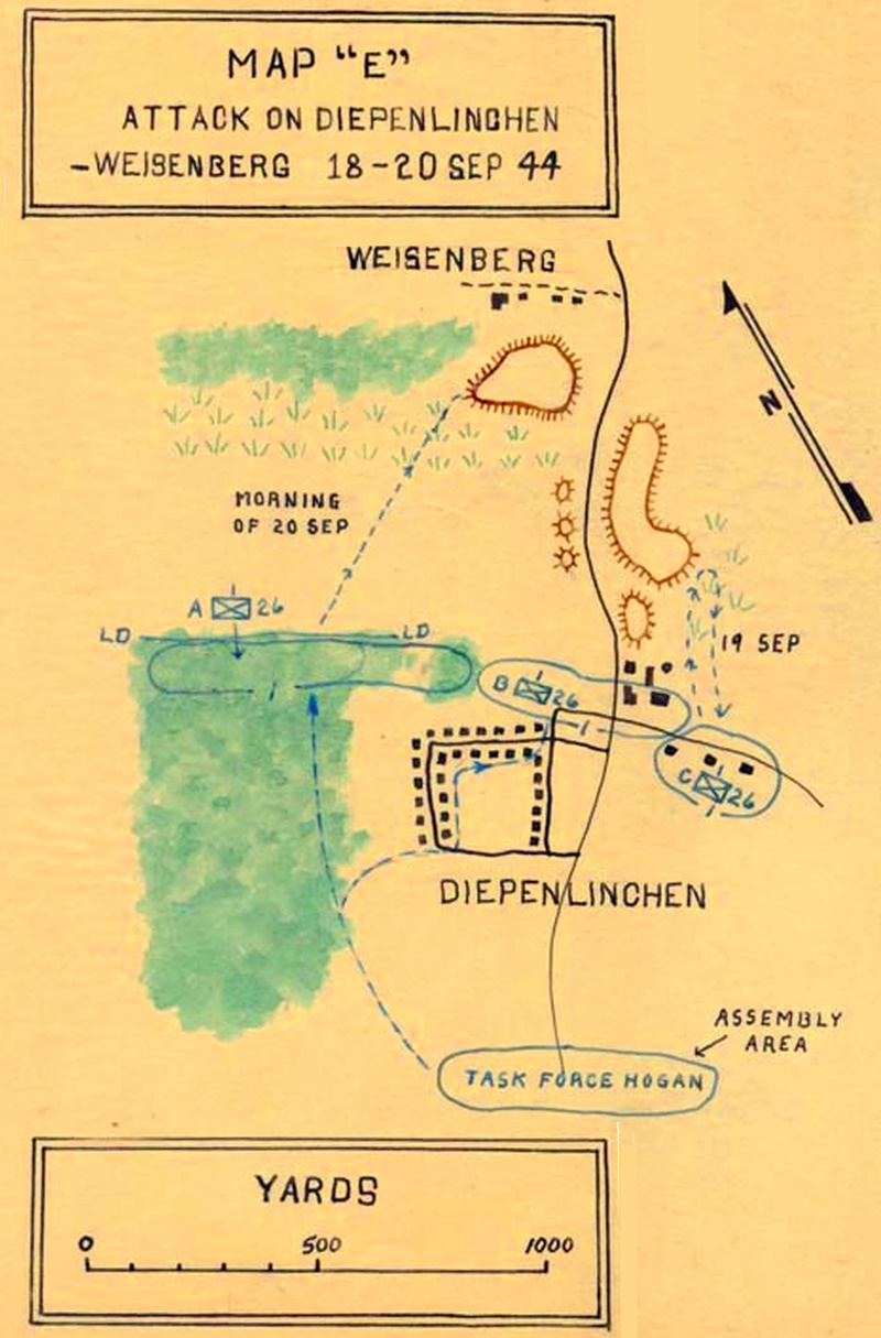 On the following day, September 19, shortly after daylight, Baker Co continued the attack in the factory area. However, due to deadly enemy fire at close ranges from behind a maze of thick walls and numerous supporting pillars, coupled with difficulties of control, progress was very slow. As a result, the task force commander decided to try the right flank envelopment. Able Co, with a company of tanks attached, would attack at 1200, from its present position, seize and defend the high ground in the vicinity of Weisenberg, putting off Germans in the factory area. Able Co jumped off with two rifles and two tank platoons abreast, leaving the balance of the rifle and tank companies in a concealed position to cover the attack. As the line reached a point midway across the open ground, it came under concentrated fire from all types of enemy weapons, including 20-MM guns. To quote the words of Col Hogan, task force commander, ‘I never saw such a concentration of German artillery before or since’. The infantry pulled back to the cover of prepared positions in the woods and the tanks, having no infantry protection, also retired.