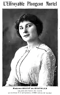 Madame Cayat de Castella, Lucienne Blaise (1887-1914). Lucienne Blaise was a French parachutist, who died on July 26, 1914, at the Stockel Racecourse near Brussels Belgium during a demonstration flight, she found it impossible to deploy her parachute; her previous jump on May 17 had gone perfectly. Only 22 years old, she was the first french woman to parachute from a plane in 1913, the same year as the American ‘Tiny’ Broadwick. Testing one of the canopies made by her husband Georges Cayat, she was tied by three leather straps under the tail, the parachute being fastened under one wing and connected by another harness to her armpits; her hands were wrapped in rags so as not to be injured by the cables to which she clung. Her husband, the inventor of an air-assisted opening system, detached it at an altitude of 800 meters, while her face was only 50 centimeters away from the propeller.