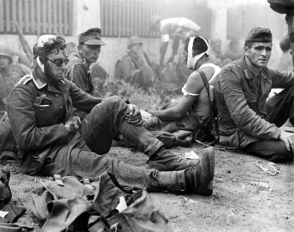B&W-Wounded German soldiers taken as POWs by American troops during Operation Dragoon. Provence-Alpes-Côte d’Azur, France. August 1944
