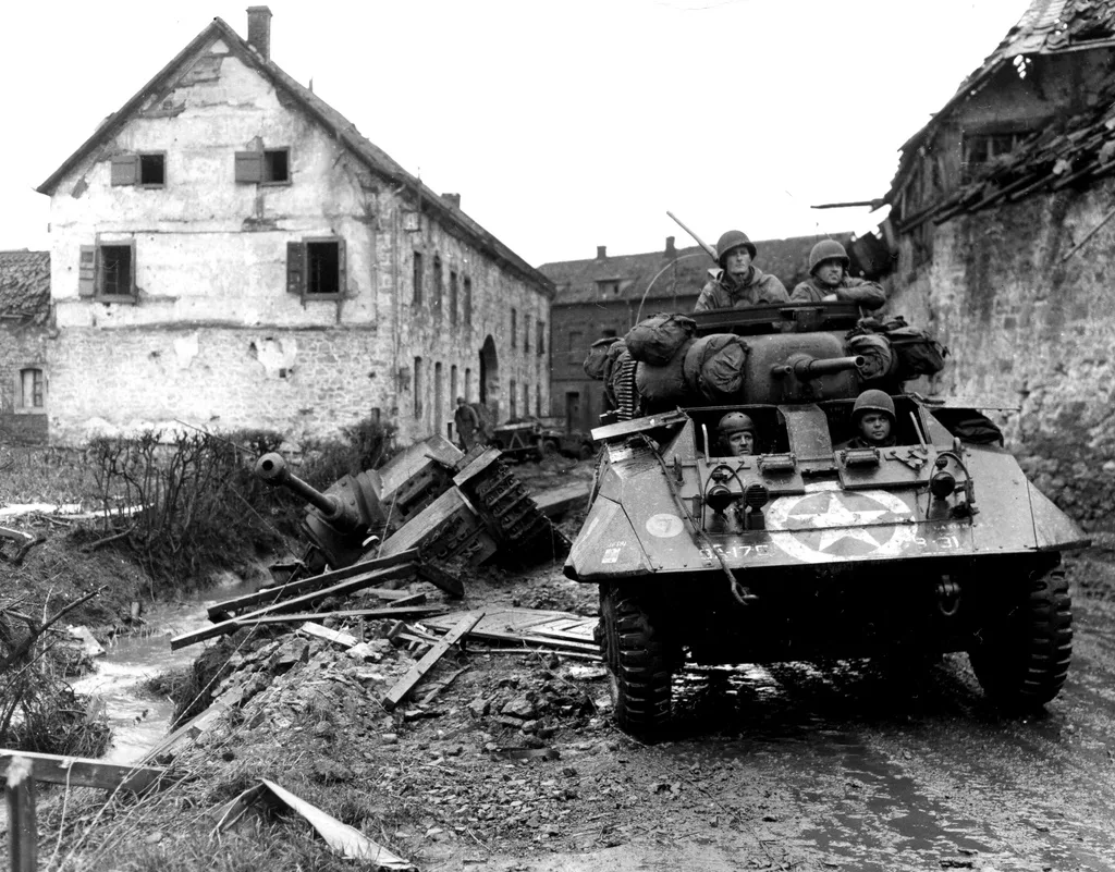An M8 reconnaissance armored car of the 30th Infantry Division moves through the streets of Kinzweiler, Germany, past an abandoned German StuG, November 21, 1944-(scaled)