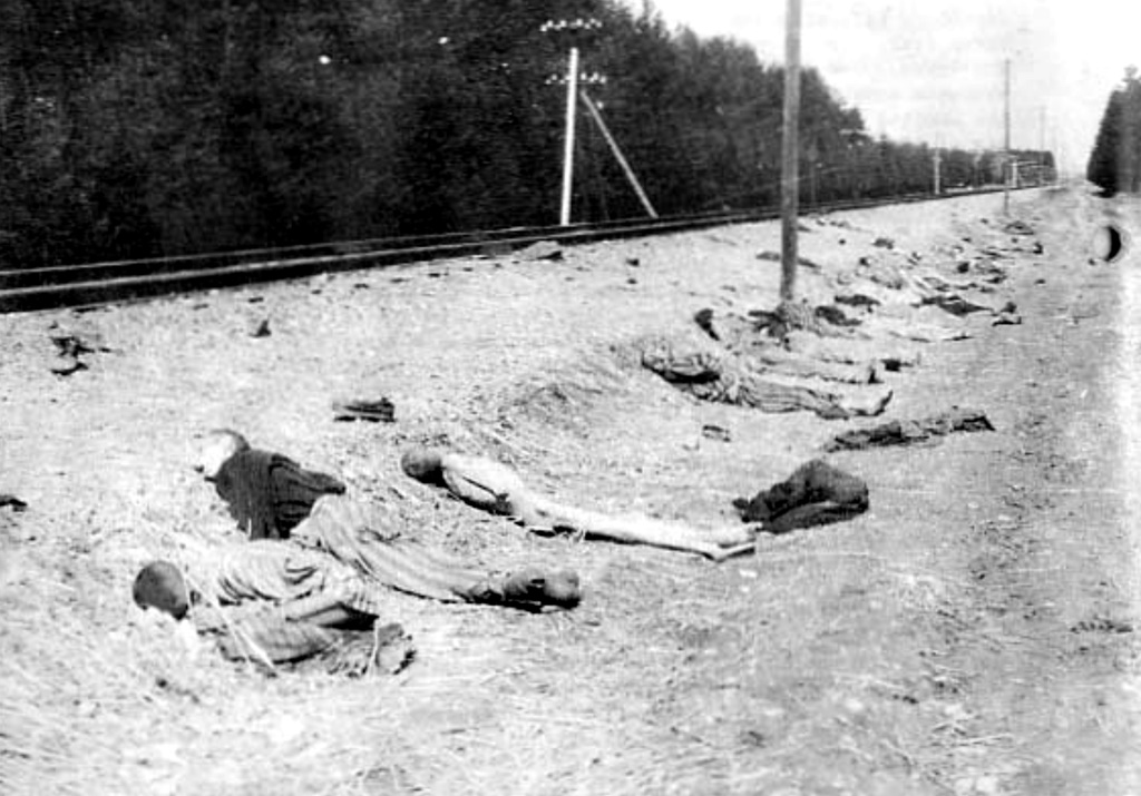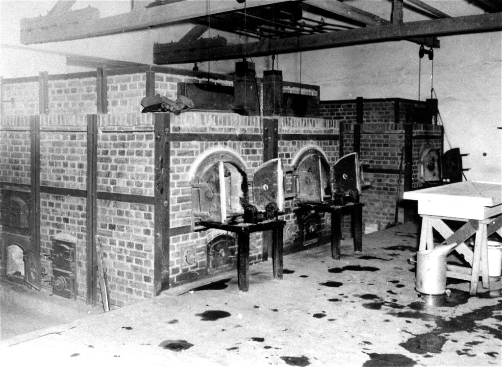 Over the long and infamous history of this place, the most common way of dying was ‘on transport’. Hence the crematory. Random examples: From a transport of 200 Belgians last July, 70 dead; a transport of French civilians arrived last October consisting of eight flat cars in which there were 484 dead on arrival. The few who could walk away were beaten to death on the spot by the guards. Asked by the interviewer whether this was not an unusual instance, Adolf Weber laughed and said: ‘Hier hatten Sie beinahe jeden Tag so ein Bild gesehen!‘ (You could have seen such a spectacle here almost every day!).