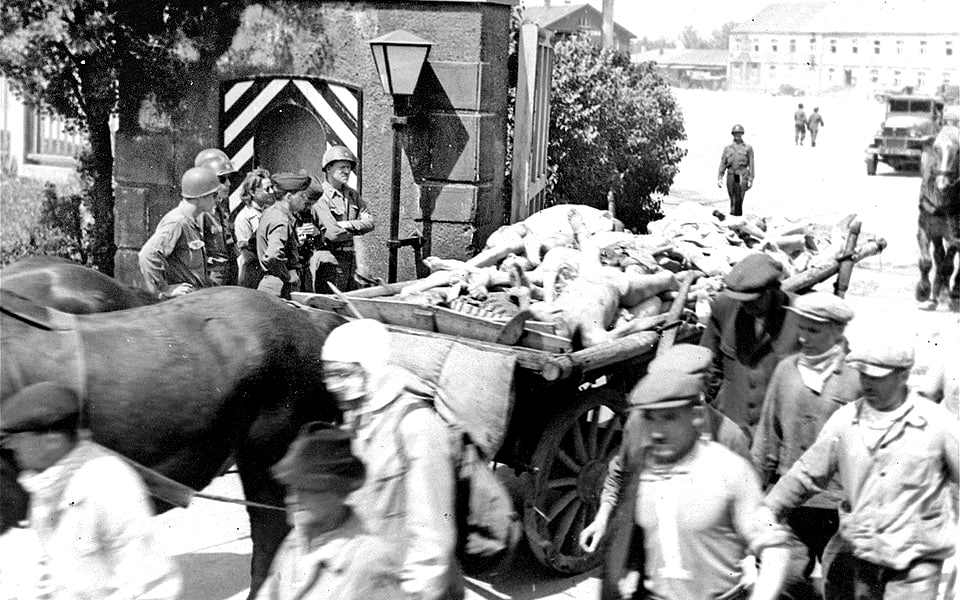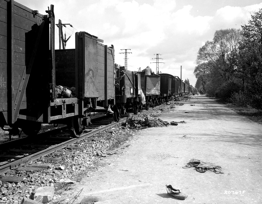 There are no words in English which can adequately describe the Konzentration-Lager at Dachau. Even though one had known of its existence for years, and had even spoken to people who had spent some time there, the first impression comes as a complete, stunning shock. One had always had – in the back of one’s mind – the reservation ‘But surely human beings can’t do this to other people’. The first thing that was seen outside of the Camp was a train of some forty railway cars of all types – mostly flat cars, a few box cars, and two or three ancient third-class railway carriages. In each of the cars thin corpses were lying in all postures, each clad in the pyjama-like uniform of the concentration camps. They lay in their refuse. Some corpses lay on the gravel roadbed, exactly where they fell when they were ordered out of the cars. There were two or three by almost every car door or gate. These were the few who were left alive when this weird train with its ghastly cargo arrived outside the gate to the camp in the afternoon of April 28; for these unfortunates were alive when they were loaded on. They were expected to be dead by the time they reached Dachau so that their corpses could be done away with in the famous crematory.