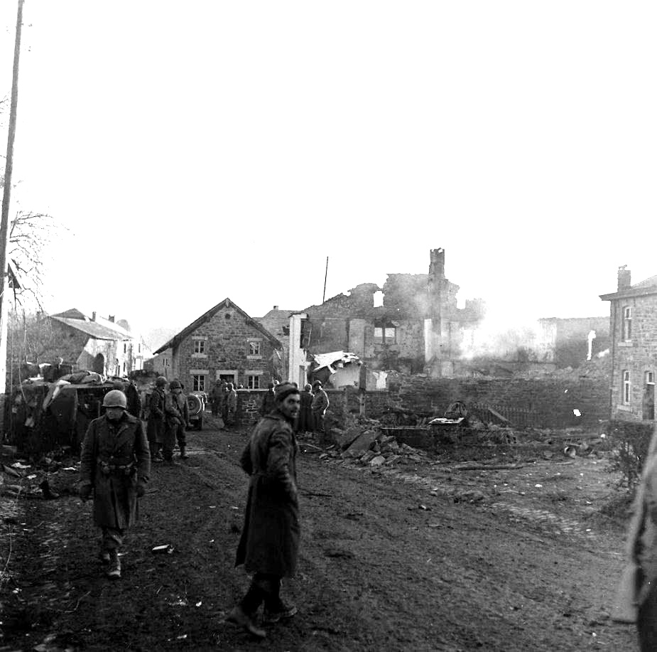The 2/119 (Maj H. D. McCown), who had been captured the previous day, (December 21), was told by the German commander, SS-Sturmbahnführer Peiper, that it was the appearance of Easy and Geoge Cos in the rear of Stoumont that caused him to evacuate the town that night. Further details gleaned by Maj McCown during his captivity, are given below. He escaped on December 25 and returned to the American lines. The 1/119 bore the brunt of the second battle of Stoumont. The total casualties during the fight were 106, consisting of 18 killed, 60 wounded and 28 missing. Of these missing, 24 of them were later re-captured at La Gleize. By some incredible miracle, none of the 200 civilians who had remained in the cellar of the sanitarium throughout the battle for Stoumont, were wounded. They were evacuated the same morning that Stoumont fell, December 22. Also evacuated that same morning following the fall of the town, were about 60 wounded German soldiers, who had been left behind in a chateau just east of Stoumont. SS-Stubaf Peiper told Maj McCown that he had to leave them behind because he lacked the facilities to give the wounded men the proper attention.