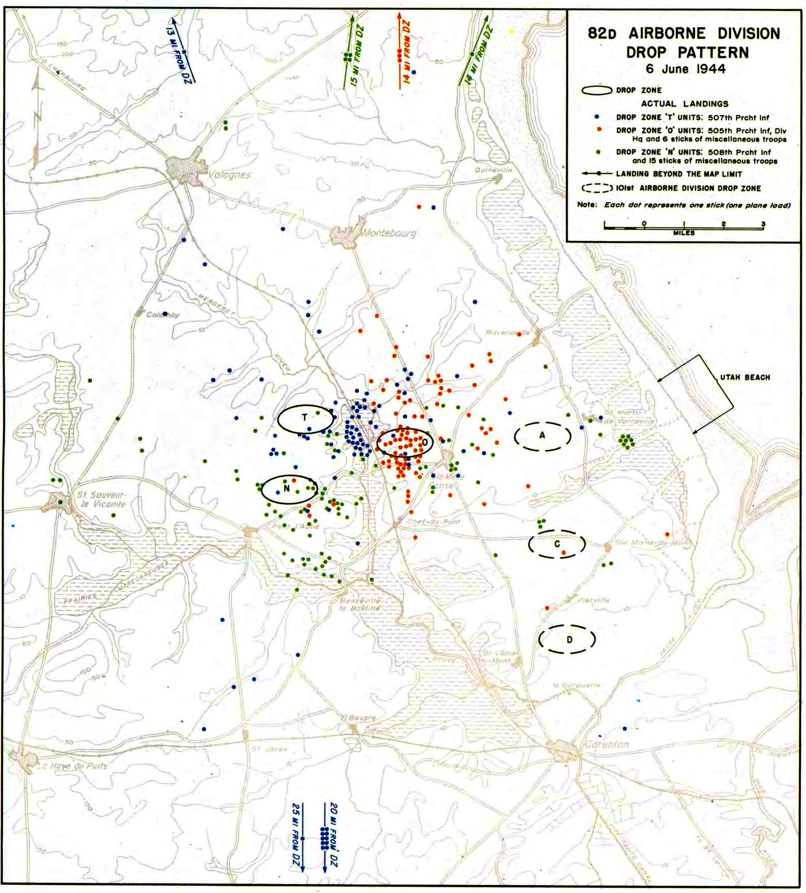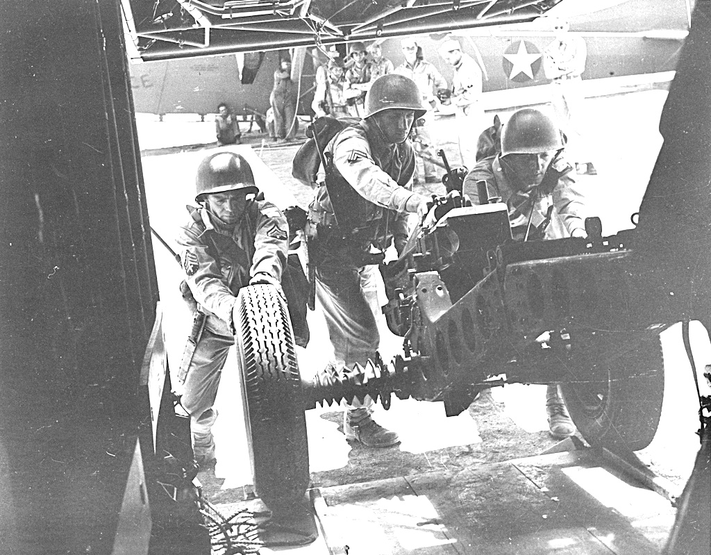 The artillery plan was influenced by our experience in Sicily. There, the parachute artillery had been committed with the infantry as integral parts of Regimental Combat Teams (RCT). Due to the scattered drop patterns, however, and the limited mobility of the artillery once it reached the ground, it possibly did more to hamper the infantry than to help it. In addition, because of its heavy equipment, artillery requires considerably more aircraft than infantry. This is always a limiting factor in its employment. It was believed that since there was insufficient aircraft to accommodate both the parachute and glider artillery, a commitment of the glider artillery would provide for better initial ground organization, mobility, and employment in mass; consequently, the glider battalions were designated. In the parachute echelon or Force A, the artillery was limited largely to reconnaissance, liaison, and forward observer parties. The plan was to commit the Headquarters and Headquarters Battery and the two glider battalions in Force B under Division Artillery control and bring the 456th Parachute Field Artillery Battalion in with the land-tail element, or Force C. Therefore, this battalion is eliminated from the airborne phase of the operation. The artillery was initially limited to two planes in Force A, but Col William Ekman, CO of the 505-PIR, made available two planes from his lift to accommodate two howitzer sections for initial employment in an AT role at the important communication center of Ste-Mère-Eglise. This mission was assigned to two sections from the 456-PFAB, who were to drop on DZ O with the 3/505-PIR and support that battalion in the vicinity of Ste-Mère-Eglise. The two planes assigned to the artillery were to drop the reconnaissance parties on DZ N with the 508-PIR. Their mission was to become acquainted with the situation, reconnoiter crossings over the Merderet River, establish a CP, select reference points, and establish communications with the pre-selected battalion position areas. This completed the artillery loads in Force A, with the exception of liaison and forward observer personnel mixed in with the infantry of all three parachute regiments.