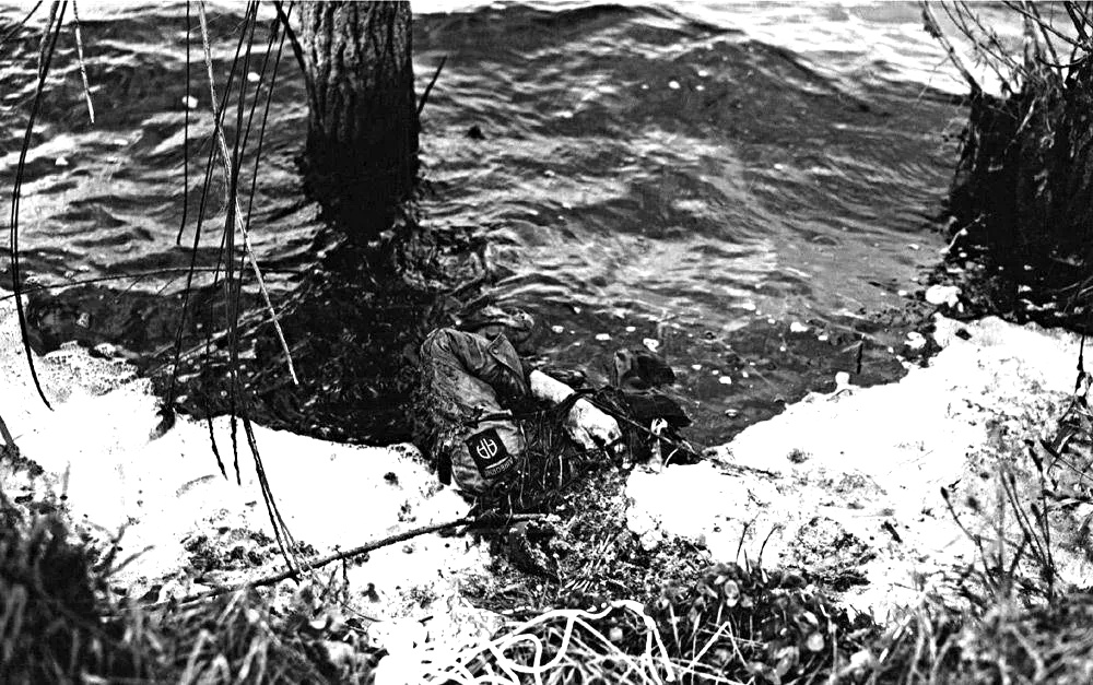 The planes were now flying at approximately 700 feet, and according to the time element they should have been over the DZ. The jump masters expected to see lights marking the DZ, but could see none even though it was now fairly clear. The planes were engaging in evasive action, and there was nothing to do except wait for the green light, which was the signal to jump. The signal was given at 0814 H and the troopers bailed out. The two ships which had been flying wing to wing were no longer together in the formation, but later events proved that they were only 400 yards apart. Nevertheless, both loads landed in the inundated Merderet River bottom, approximately one-half-mile north of La Fière, thereby missing their DZ by approximately one and one-half miles. The marsh was deceptive. What appeared to be only marsh grass from just a few feet away actually was marsh grass, but it was growing in from two to six feet of water. Comparatively ineffective enemy fire was sweeping the area, but the principal threat to immediate survival was the water, The ground wind was sufficient to pull the paratroopers into a prone position, quick release harness had not been adopted yet (T-7 Pack Assembly), and the most expeditious means of getting out of the parachute was to cut the harness. By the stronger helping the weaker and a wonderful spirit of cooperation, the artillerymen were able to extract themselves without casualties due to drowning. The Division suffered thirty-six known casualties due to drowning that night.
