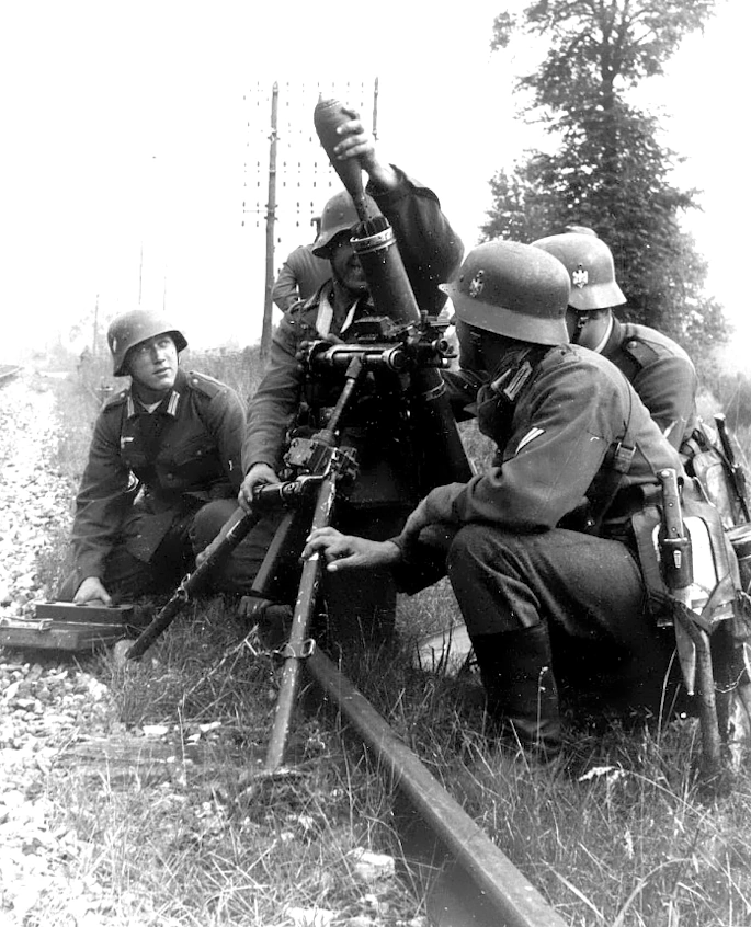 The German 8 CM Granatwerfer 34 (GrW 34) (Mortar 34) was a medium mortar used by the Wehrmacht during World War II. Known for its robust design and reliable performance, it played a significant role in German infantry operations, providing indirect fire support. This medium mortar introduced in 1934 was manufacturer by Rheinmetall. The mortar weighed 62 Kg in the firing position with the 1.14 M (44.8 inches) barrel. The caliber was in fact 81.4-MM (3.2 inches), the rate of fire was up to 15-25 rounds per minute with a maximum range of 2400 M (2,600 yards). To be operated, this gun typically used a team of 3-4 soldiers. This weapon consisted of three main parts for ease of transport and assembly; the barrel, the bipod; and the base. The GrW 34 fired a variety of 81.4-MM rounds, providing versatility for different combat situations. The shells were fin-stabilized to ensure accuracy. HE shell (Wurfgranate 34) was used against infantry and light fortifications. It weighed 3.5 Kg (7.7 lbs), was with TNT or Amatol and could be used with an impact or delayed-action fuse. Smoke shell (Nebelgranate 39) was used to create smoke screens for concealment or signaling as well as igniting fire because the shell was loaded with white phosphorus or a chemical smoke agent. Illuminating shell, (Leuchtgranate 40), was used to provide illumination during nighttime operations, a small parachute being use to achieve and extended burn time.