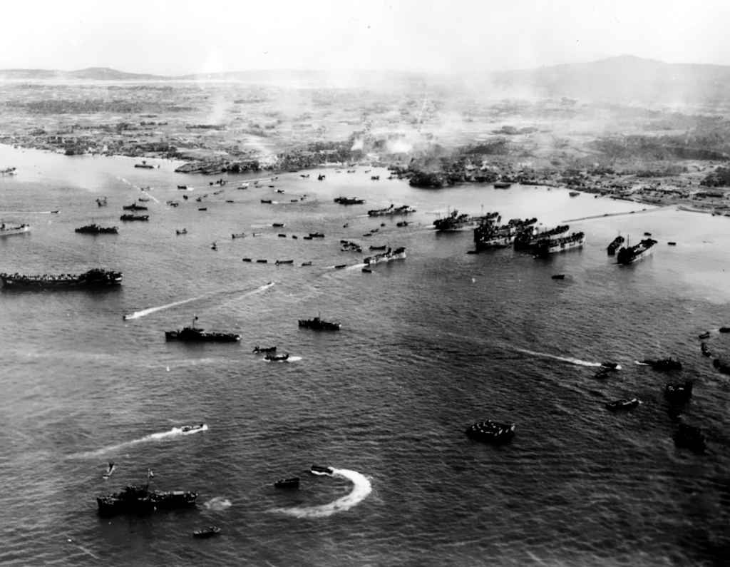 On Easter Sunday at 0705 on April 1, 1945, LSTs of the 3/381-IR arrived in their respective areas and proceeded to launch amphibious craft according to plan. The long awaited landings were about to begin. The Battalion Landing Team ate an early breakfast aboard ship with the uppermost thought in every soldier’s mind, ‘What will the Japanese do to prevent our landing?‘ The public address system announced, ‘All personnel proceed to the tank deck and prepare to load LVT’s’. The veterans of the Philippines knew the stage was set. The troops were loaded by 0705 and the assault craft began driving off the loading ramp into the China Sea and headed for the Line of Departure approximately 2000 yards off shore. The rumble of supporting naval gunfire and air bombardment grew intense, LCI Rocket, 40-MM and 4,2 mortar boats pounded the beaches. The assault waves were formed according to plan and headed for White Beach 1. The 75-MM guns of the 780th Amphibious Tank Battalion in the first wave opened fire on the beaches and continued to fire on beach installations while advancing toward the beaches. The landing time was selected at high tide to enable craft – other than track landing vehicles – to get over the reef. About 350 yards off shore the alligators hit the reef but continued toward shore without interruption.