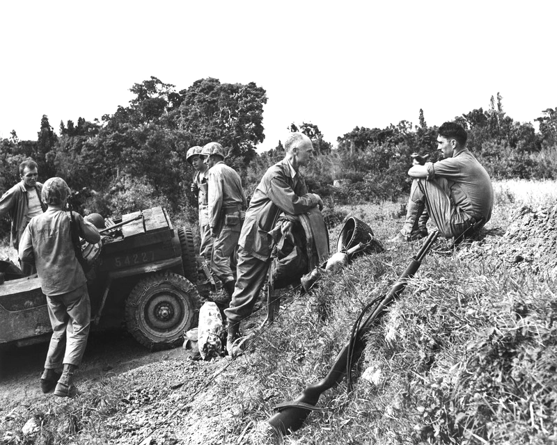 (Above) A text from Ernie: ‘After the ear-shattering pre-landing barrage, and the commotion of the landing, a strange peace descended on Okinawa. Anomalous as it was be speaking an absence of Japanese resistance to the invasion of the doorstep to their homeland, the hush was in a sense fitting, since the opening day of the operation was on April 1 Easter of 1945. Behind the forward thrusts of the spearheads, marines and soldiers first warily, then with delight took advantage of the pastoral calm. Their foxholes dug, and the primary installations set up, they broke open chow rations, chose pets from among the goats roaming about, strolled around the rolling littoral, or just stretched out for forty winks. The battle was not won, or even joined. But to these hardened Veterans of Guadalcanal, Bougainville, Tarawa, Palau and Leyte, this was the oddest invasion of them all one which was truly symbolized by the designation for the opening day of the assault: ‘Love-Day’. Halting for a moment during his jeep-tour of the beachhead, War correspondent Ernie Pyle chats with his ‘Chauffeur’, Pfc J. P. Murray of the marines, who hails from Winthrop, Mass., in Japan on April 11, 1945.