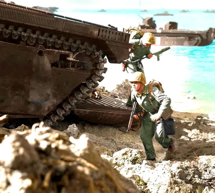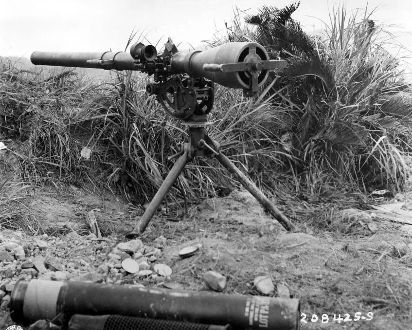 In the 383-IR zone, resistance was light initially. The 2/383 on the right, and the 3/383 on the left, jumped off at 0700. The 2/383 secured the Ora Hill – (7662-S), and the 3/383 advanced approximately 200 yards before being held up by machine gun fire. The battalions continued to advance slowly, however, by 1215 had reached the railroad tracks running east and west through the regimental zone approximately 700 yards north of the escarpment. Here the advance was stopped by heavy machine gun fire coming generally from the Beatrice Hill – (7661-B) on the right flank in the 1-USMC Division zone and the escarpment on the left flank. This machine gun crossfire swept the flat open terrain north and east of Yuza – (7661-DE) and made advances up to the base of the escarpment impossible. Heavy fire fighting continued throughout the afternoon with medium tanks, 57-MM M-18A1 as well as the 75-MM M-20 recoilless rifles, 75-MM AT guns and all the Canon Companies’ weapons firing directly into enemy positions. By the end of the day, however, the machine gun positions were still holding out. Front lines of the regiment were consolidated for the night just south of the Railroad Tracks north and east of Yuza.