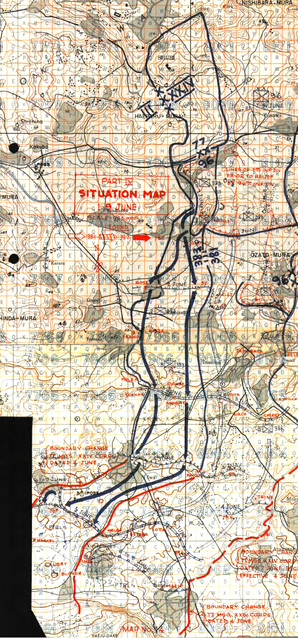 The boundary change between the 7th Infantry Division and the 96th Infantry Division, previously ordered by TT message from Hq XXIV Corps dated June 2, became effective at 0730 on June 4. Substantial gains were made by all front line units on June 4 despite extreme difficulty encountered with the terrain, weather and transportation of supporting weapons. The 383-IR advance was opposed by isolated, yet strong delaying groups of enemy and by particularly heavy machine gun fire coming from the high ground on the division right flank (78S4). It was not until that the 1/383 with supporting weapons had moved forward to the Yvonne – Dionne Hills and placed neutralizing fire on the enemy along this high ground (7864) that the 2/383 on the regimental right, was able to push on and secure the north edge of the town of Iwa. The 3/383 advanced steadily during the day, but by 1800 were unable to secure the high ground at (8064-U) due to heavy enemy fire from their front and left flank.