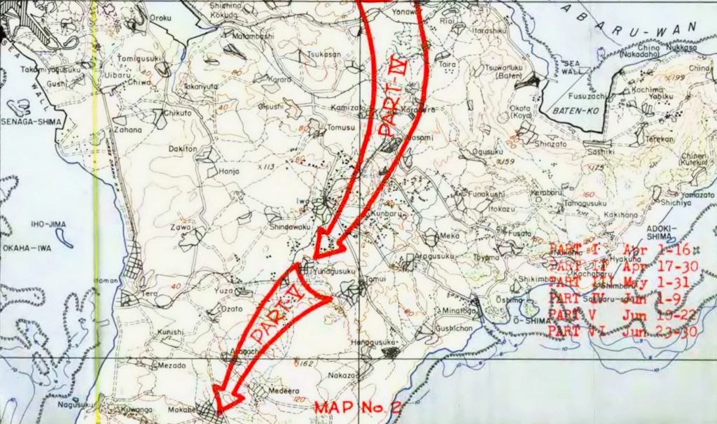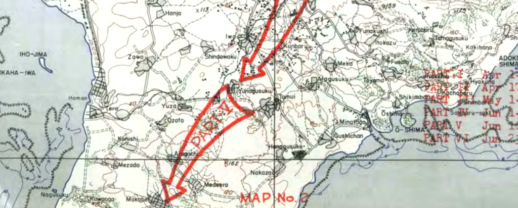 As a result of these activities, the division advanced front lines 1000 to 1300 yards securing the last dominating terrain feature short of the enemy’s last defense line, the Yuza-Dake Escarpment. The 2/305 (77-ID) continued to protect the right flank and rear of the 96-ID and advanced one company as far south as the Dionne Hill.