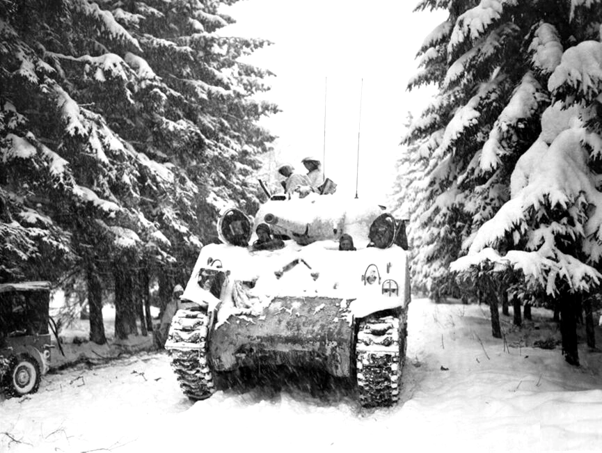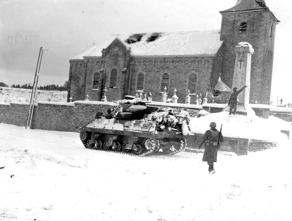 Under the reorganization plan implemented by Lt Col Damon, Capt Lindsey and the remnants of his B Troop received 27 men from the 14th Cavalry Group Headquarters Troop who were accompanied by that troop commander Capt North. In addition, Lindsey received two M-20 armored personnel carriers to replace the two M-8 armored cars that he had lost. A three-quarter-ton truck and a bantam were also added to the troop’s depleted vehicle complement, and the unit was reorganized and fit for combat at 1500, December 19. Total strength of the troop at this time was about 125 – 130 officers and men. At 1500, Lindsey was ordered to procede south on the Salmchateau – Bovigny Highway, and take up positions in the towns of Gruflange, Thommen, Espeler. His troop’s normal strength (reorganized) was augmented by three platoons of 75-MM towed howitzers from reorganized E Troop, and eleven light tanks (five from the 32nd Squadron, balance from the 18th Squadron). For the purposes of simplification of control and nessage-writing, Lindsey‘s force was known as Task Force Lindsey and operated in the sector of Task Force Jones, part of the 7th Armored Division’s troops in the area. General purpose of the armored and cavalry units in this area was to organize a defensive screen around the southern mouth of the Bovigny (Belgium) – Salmchateau (Belgium) corridor. It was down this corridor that the supplies for the fighting elements of the 7th Armored Division came, and up this same corridor that different Ordnance, Quartermaster and General Service and Supply elements were withdrawing in the face of von Rundsteëtls attack.