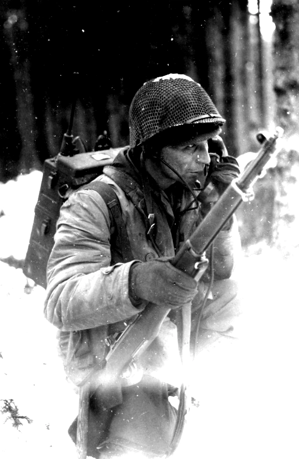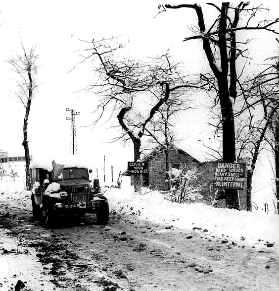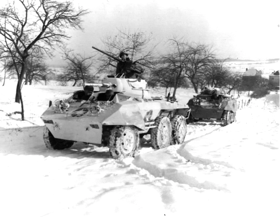 The news was immediately relayed to squadron headquarters, and a ‘roger’ reply secured by 0720. Minutes later the next armored car in the nearer team on the Andler – Auw road flashed a similar messages but in this case gave added warnings of tanks being used by the enemy. ‘Enemy surrounding us – tank trained on armored car’, came the message from the vehicle which was less than 500 yards from the troop CP. A more detailed account of the second attack was later learned by Lindsey. This report came from four members of the team Cpl Royon, T/5 Whiteside, Pfc Battiori and Pvt Henderson. These four men had been standing near the armored car when the attack suddenly bursted in upon then. They were also to make their way back to the troop CP and tell of the tank and the enemy infantry dressed in snow camouflage suits, that had suddenly swept in upon them. It was 0730 by this time, and Lindsey sought permission from the squadron to begin a withdrawal movement towards Schoenberg. The static position deprived his troops of the organizational mobility that was one of their strongest weapons. He did not want his troop to be overpowered in the darkness, when they could fight a more telling battle in daylight – as was later proven. However, all vehicles and men had assigned fields of fire and they started to blaze back at any sign of enemy movement that they saw. It was only a few minutes before an enemy tank reached the intersection where the road from Auw joins the Eimerscheid – Schoenberg road at Andlermühle (Belgium). The attacking enemy seemed to have the outpost positions well plotted and mortar as well as and flat-trajectory fire struck near the troop CP. Pvt Henderson, one of the four men who had escaped being surrounded at the second reconnaissance team to be struck by the enemy, was wounded by shell fragments as he fought near the CP.