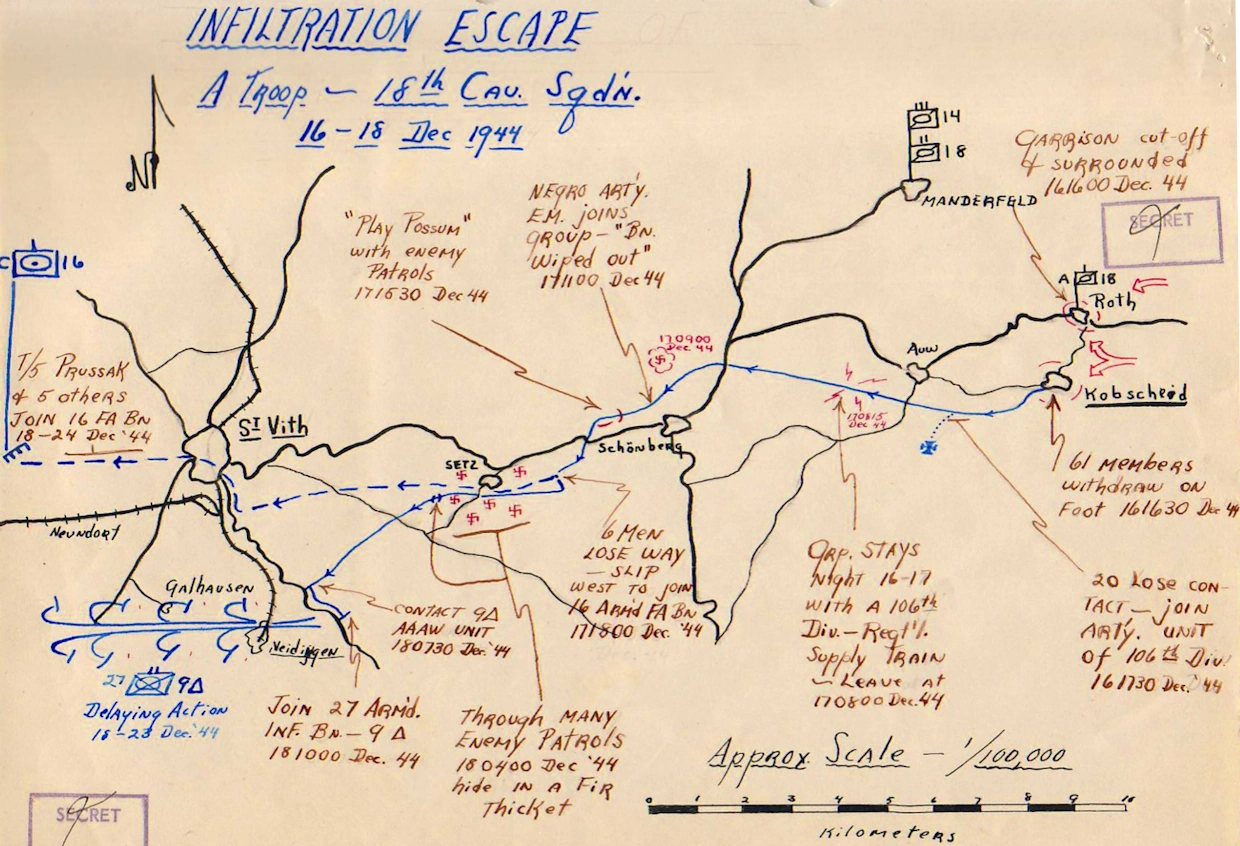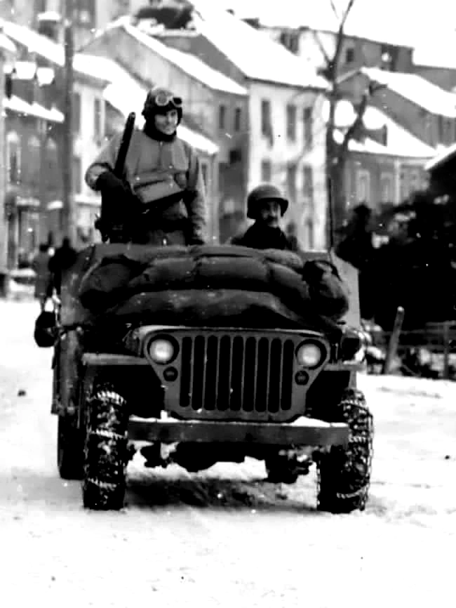 At Meyerode, which the troop reached by traveling through St Vith, Capt Lindsey reported on his four-hour fight that costed him no casualties. He was instructed to take up positions in Wallerode (Belgium), southwest of Meyrode. The troop was in position by 1400 hours, and settled down to watching the wooded terrain to its east. It was at Wallerode that several of the troop’s reconnaissance teams that had been cut off from the main body of the B Troop by the enemy’s sudden advance at Andler, rejoined the troop. Sgt Donald E. ‘Bones’ Thompson, in charge of the teams that were strung along the Andler – Herresbach road, extricated his people by joining with the forces of C Troop and finally withdrew from Herresbach over the cross-country trail that was blazed to Meyerode. Sst. Howard L. Hall, whose single reconnaissance team had been positioned north of the Andler – Auw road junction and was cut off by the appearance of a German tank at that intersection, took his team to the north, and then we went southwest. He did not recall the exact route nor the names of the villages through which he passed. The amazing part of his statement concerning the escape, is that he passed through territory that had been over-run by the enemy two or three hours earlier. The B Troopers’ stay at Wallerode was uneventful save for the P-47’s that strafed the woods to the east of their positions at aout 1600. Evidently, the Germans had brought light flak guns well forward with them in their rapid advance for a heavy blanket of light flak rose to meet the passes of the American fighter-bombers. When asked about other units in the area, Lindsey remarked that Fox Co of the 32nd was known to be in the vicinity of Wallerode, and that some of his men there had met the 1st Sgt of D Troop, 87th Cavalry Recon Squadron, attached to the 7th Armored Division. Shortly after 1600, B Troop was told to move towards Vielsalm. Traveling via Sart-lez-Saint-Vith (Belgium), Poteau (Belgium), where at 1900 where they saw enemy flares to the north, they inched through traffic jammed roads in the darkness and arrived at Vielsalm 0550, December 18, 1944.