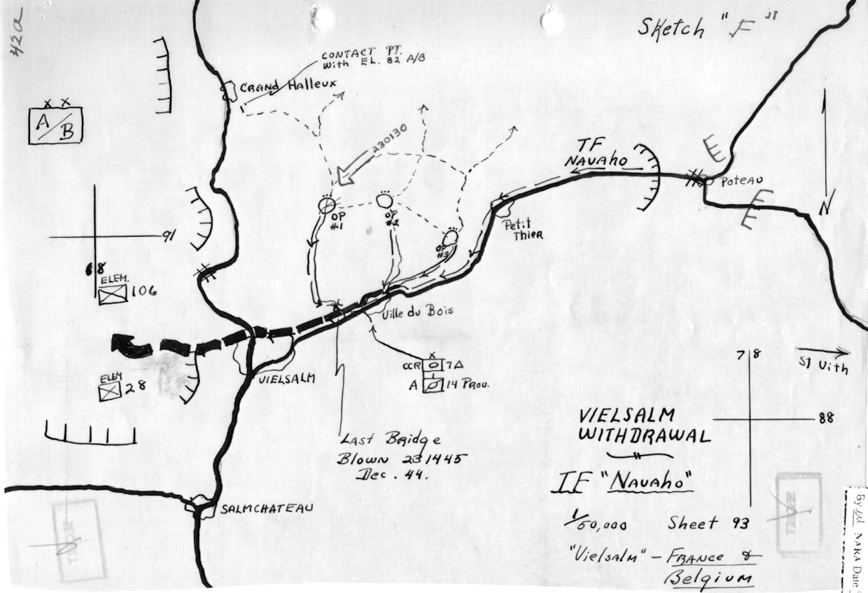 Purpose of this employment of B Troop was to create some sort of a screen through which the elements withdrawing from Poteau could pass. Lindsey chose to organize the Poteau – Vielsalm road at Ville du Bois (Belgium), where he took advantage of a déep-cut railroad horseshoe to use as an anti-tank trap. He placed the weapons of his armored cars and reconnaissance teams in an all-around defense at this point, and found that the continuously over-lapping bands of defensive fire had very good ranges at which to operate. However, this defensive position was never used. The withdrawing troops from Poteau passed through a road block that had been prepared by Task Force Navaho (Section 7th Armored Material) and at 1600 Lindsey joined the remnants of the whole group in the vicinity of Rencheux (Belgium). There, the remnants were reorganized into a single cavalry reconnaissance squadron which was immediately attached to the 7th Armored Division.