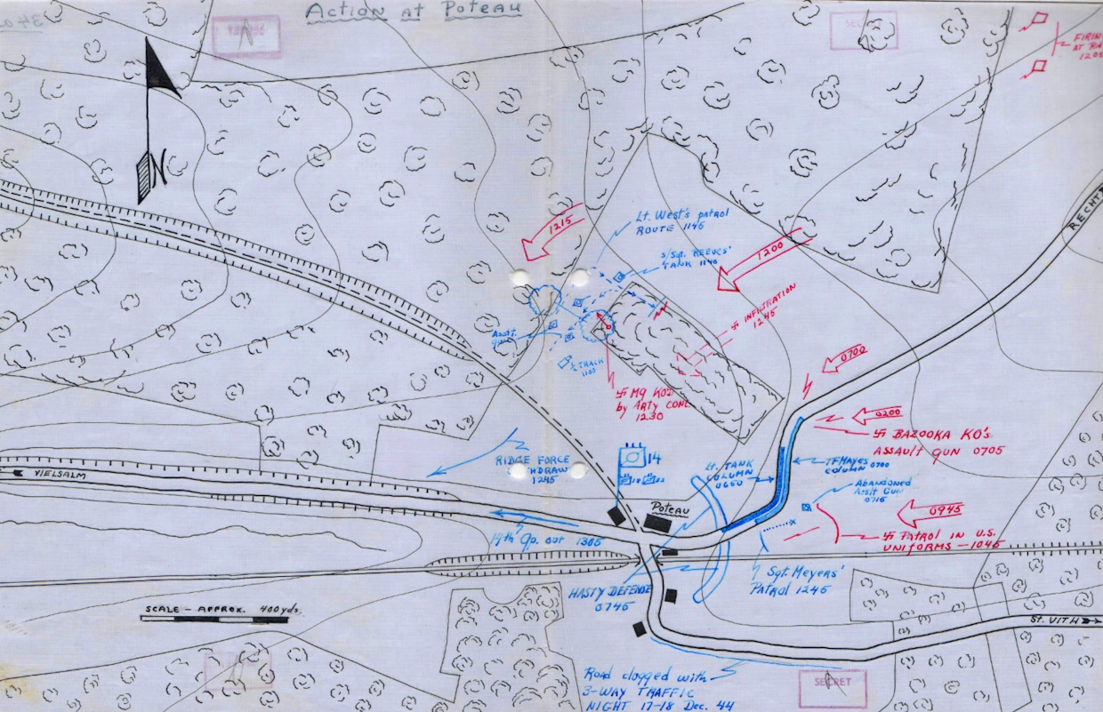 Document source: Action at Grandmenil – Manhay, C Troop – 32nd Cavalry Reconnaissance Squadron, December 28, December 30, 1944. (B Troop, 32nd Cavalry Reconnaissance Squadron, 14th Cavalry group (Mecz). Document created at Hognoul (Belgium), January 7, 1945. Information collected from Capt Franklin P. Lindsey Jr, (Commanding Officer); 1/Lt Ralph A. Bendinilly (Executive Officer); 2/Lt William Reilly (1st Plat Leader); 2/Lt Robert A. Blodgett (2nd Plat Leander); 1/Lt Marshall Alexander (3rd Plat Leader) and Cpl John Unger (Demolition).