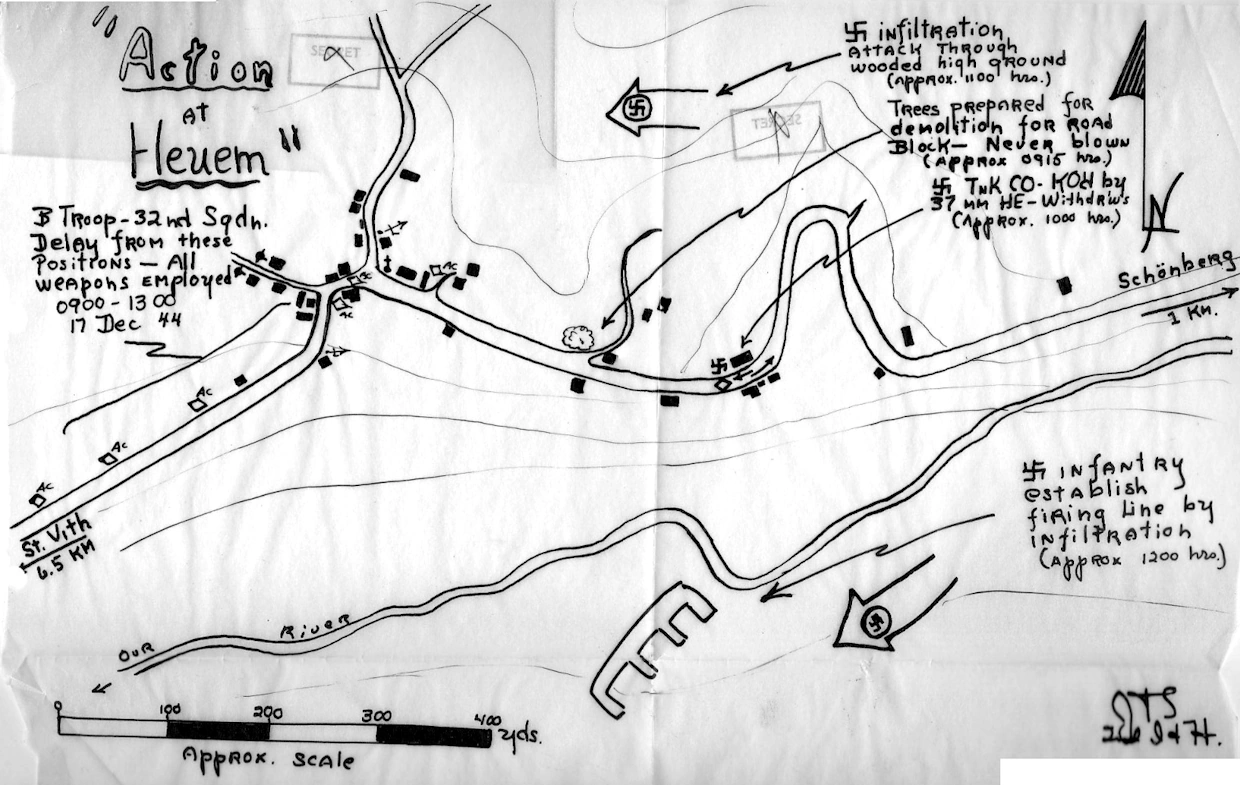 Until 1200, the enemy infantry seemed to try blind attempts at infiltrating towards the cavalrymen’s positions. None of the group could sense any particular maneuver that the enemy had tried until around 1230 or 1300 when a definite plan seemed to have put into action, and in fact seemed to be meeting with some success. Roughly, the the enemy managed to infiltrate a few men forward to the southeast of the cavalry positions. This section of troops provided a base of fire for a flanking force that was sent up through the woods on the high ground that commanded the northern approaches to the cavalry positions. However, the success of failure of this maneuver was never determined, for, at 1300, the 32nd Squadron ordered the B troopers to continue their withdrawal towards Meyerode. At Heuem, B Troop had successfully held the enemy for at least four hours.