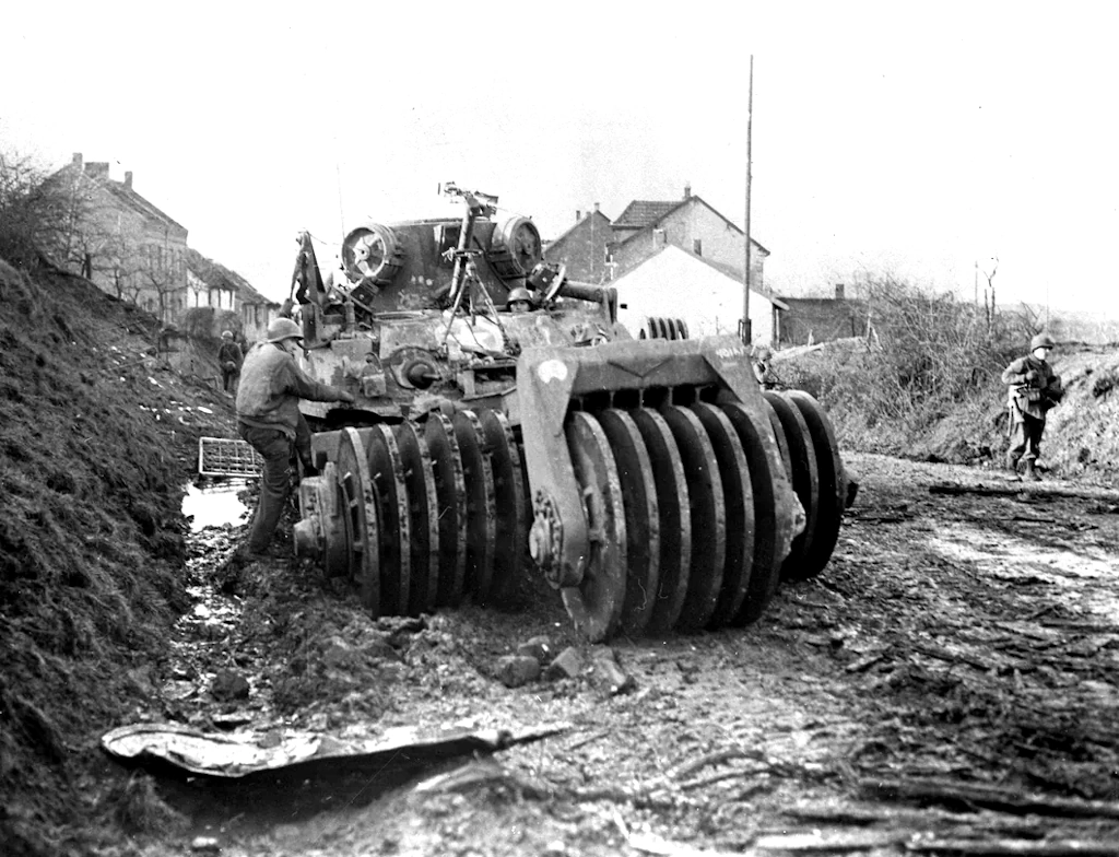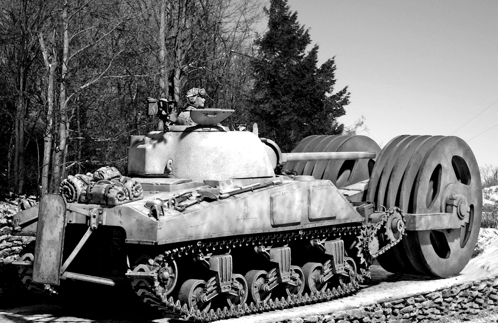From January 13 to January 16, the 30-ID had 15 tanks disabled by AT mines. The mines, buried under several inches of snow and ice were not located by our mines detectors. Therefore a request was made of XVIII Airborne Corps for the use of mine busters. These were secured and used to excellent purpose a the Division roads. They were valuable because of the effectiveness with which they performed their primary function, detonating AT mines. They were also of great aid for the psychological effect they had on jeep, tank and truck drivers. Those man felt the road was safe, once mine buster had gone over it, and as such, their task of driving, with the nervous strain eliminated, was made easier. The mine busters of the 738-TB, utilized were of two types. One type had