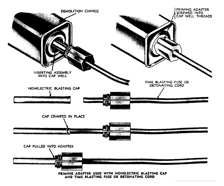 The Priming Adaptor M-1 consists of a plastic fitting with a 9/16 inch NC thread on one end, a slot to take electric lead wires, and a shoulder so designed that fuze or prima cord passes through it but it holds a cap. It is used in conjunction with all explosives containing a threaded detonator well. The priming adaptor is made of a suitable plastic, olive drab in color. The Priming Adaptor M-1 is used to hold detonators in place in explosive blocks or any explosive fitted with threaded detonator wells.