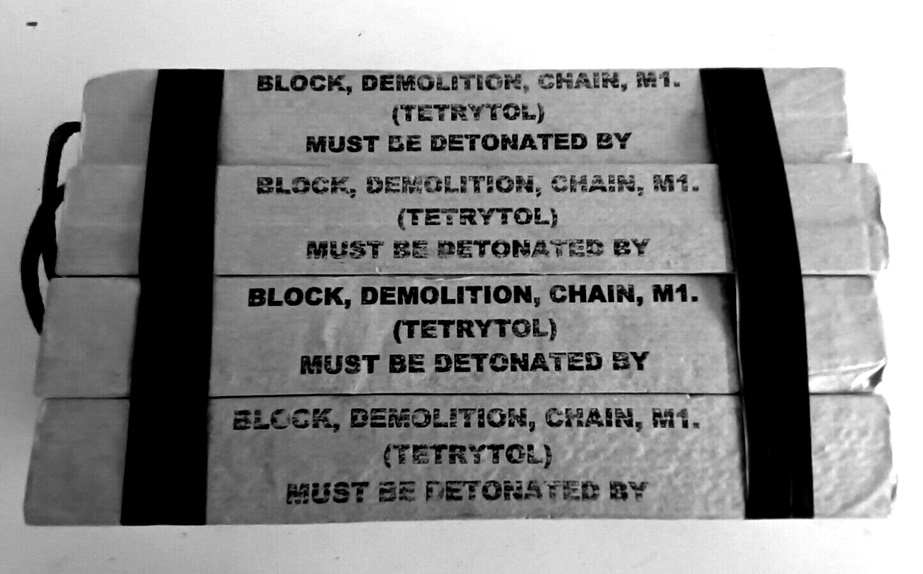 The Block Demolition Chain M-1 assembly consists of eight 2″ x 2″ x 10″ blocks of Tetrytol strung on a prima cord and packed in a haversack for ease of use and handling. The entire chain or any part of it may be used laid out in a line, wrapped around an object, or detonated as packed in the haversack. Each block is rectangular in shape and is enclosed in a white cotton bag. One block is equivalent to six 1/2-pound TNT blocks. The blocks are cast in place with 8 inches of prima cord between blocks and two feet of free prima cord at each end of the assembly. The eight blocks and prima cord as assembled weigh 21 pounds; the entire assembly 22 pounds. Two complete units are packed in a wooden box. Tetrytol is a more powerful explosive than TNT. It is also more brisant and therefore more effective where a cutting charge is needed. The prima cord is detonated by means of a blasting cap in order to fire the chain. The blocks and the cord are quite insensitive to shock but the assembled units are slightly more sensitive than TNT. Sympathetic detonation between unconnected blocks can be obtained when they are separated by as much as 10″ in air. The blocks are not affected. by moisture and can stand submergence in water for 24 hours without appreciable effect upon their characteristics. The care, handling, and storage of material are the same as for TNT blocks.