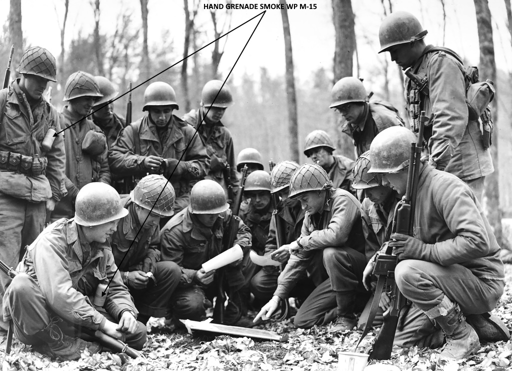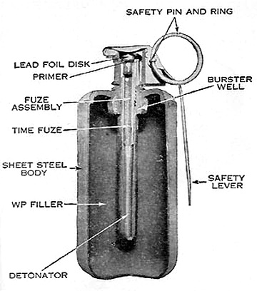 This hand grenade is designed for laying smoke screens, and for incapacitating enemy personnel by means of severe and slow healing burns caused by the white phosphorous filler of the grenade. The M-15 grenade is cylindrical in shape. It is 4 1/2 inches high, with a diameter of 2 3/8 inches. It consists essentially of a grenade body, a burster well, and a Fuze, Detonating, Hand Grenade, M-6A3.