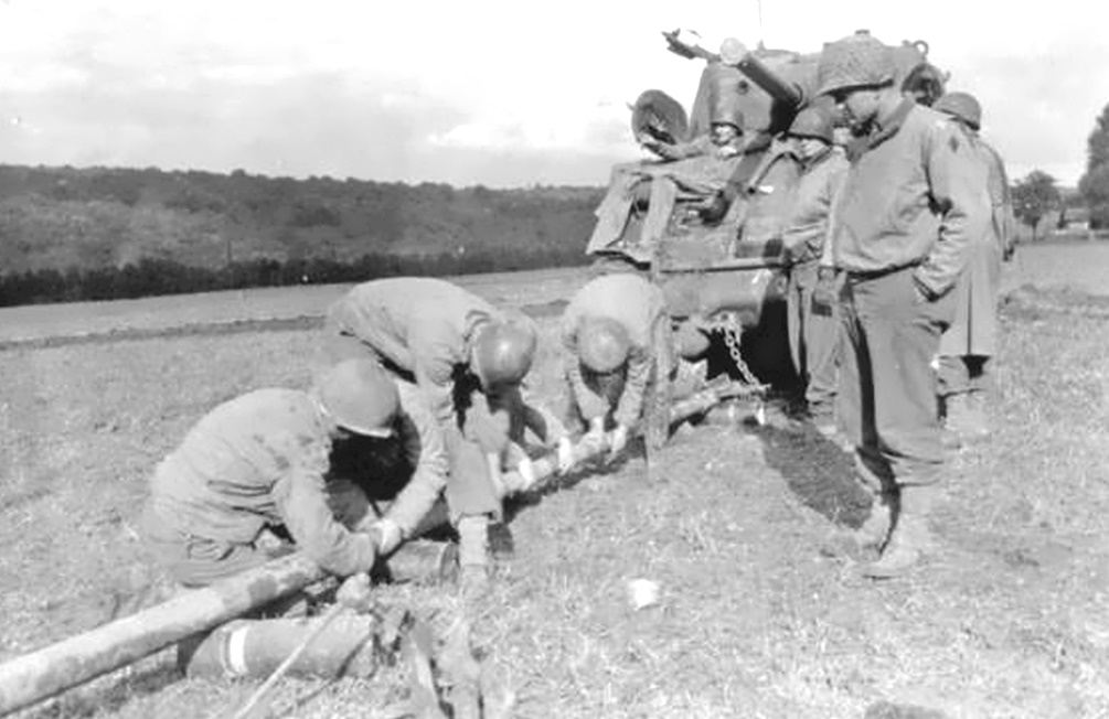 The snake was designed for creating a path through antitank minefields but is very effective against other targets such as concrete tank obstacles and in clearing a path through thick natural growth. A 400 ft. snake loaded with 3-3/4″ cartridges will blast a crater approximately 100 yards in length, from 9 to 12 feet in width, and from 2 to 3 feet deep, depending on the type of soil and its moisture content. For shipment, the snake is packed in 85 packages occupying a total volume of 188.6 cubic feet. The gross weight when packed is 13,741 pounds, while the net weight, assembled, is 12,491 pounds. It is transported in two 2.5-ton trucks and can be assembled in two hours by a squad of twelve men.