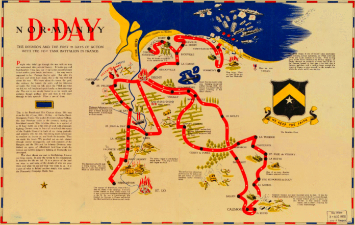Omaha Beach, June 6, 1944, France. 0600 in the morning. Sunrise. Chill, wet wind. In the Channel, heavy weather. Angry waves churned and tossed by a day-old gale. From the night’s assembly area where the invasion craft had gathered, then from a Line of Departure in the Bay of the Seine, the assault force of the 743rd Tank Battalion moved toward combat. At this moment, the General Sherman tanks were out of their element, immobilized within the steel sides of the Navy’s LCTs. Two companies of tanks were especially waterproofed, equipped with top secret canvas sheathing and propeller drives which would allow them to ‘swim in’ to the beach under their own power when the box-nosed ramps of the Landing-Craft-Tank were dropped in deep water offshore. But the high-running waves defeated this planned tactical surprise. The 32-ton swimming tanks could navigate only in reasonably calm water. It was now up to the LCTs to go in all the way. Bucking and tossing, loaded to capacity, each with four medium tanks and their crews, the amphibious vanguard approached shore.