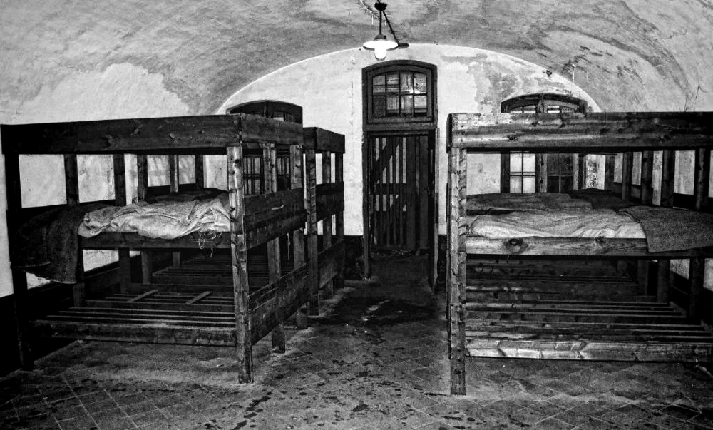 (d) There are six dark cells into which no daylight can penetrate. These cells have white-washed walls and stone floors. They each contain a plank bed, which was kept against the wall during the day or removed from the cell. In addition, there was a bucket for a latrine.