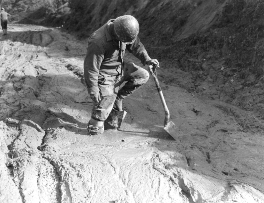 Progress was extremely difficult. The ditch was muddy, shallow, and only 3 to 4 feet wide and deep. To the men, it seemed as though the slushy ditch stretched for miles instead of a mere 1000 yards. The platoon pressed forward as rapidly as possible, driven by the urgent need to reach the objective before the fog lifted. Nearing Maceratoio, all attempts to contact the 2nd Platoon failed. Nevertheless, the 1st Platoon continued moving forward.