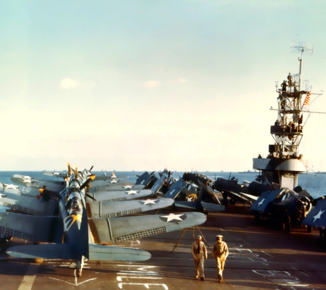 The Santee launched 143 flights, which dropped 96 bombs and fired 5308 rounds of ammunition. Two French aircraft were shot down, 48 damaged on the ground and over 40 trucks damaged or destroyed. As an indication of the spirit animating our airmen the following incident is stirring. As H-hour approached one rear seat gunner was offered $230 for his place in the first flight. He declined the offer. When the plane landed on board the carrier he was found dead in the cockpit.