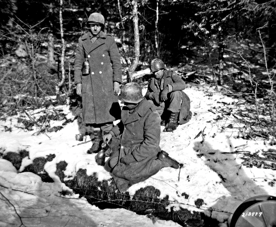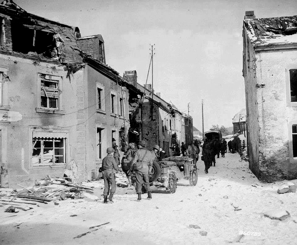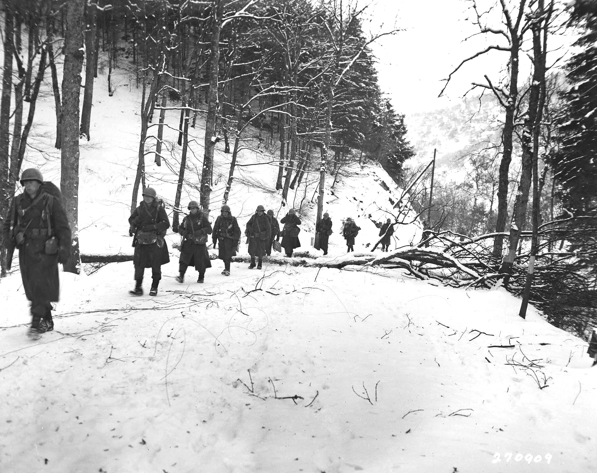 In December 1944, the strategic situation changed dramatically with the launch of the German Ardennes offensive, known as the Battle of the Bulge. The 26th Infantry Division was rapidly redeployed northward to help contain the German breakthrough. Moving into Luxembourg, the division occupied defensive positions in the path of advancing German forces. The fighting in Luxembourg was intense and often chaotic. The division was required to hold key terrain, delay enemy advances, and participate in counterattacks under severe winter conditions. Temperatures were low, supply lines were strained, and the operational picture remained fluid. Despite these challenges, the division contributed significantly to halting the German offensive and stabilizing the front. Once the immediate crisis of the Ardennes had passed, Allied forces resumed offensive operations. In early 1945, the division returned to the Saar region and participated in renewed efforts to breach German defenses. The capture of Saarburg and subsequent advances into the Rhineland marked a turning point. German resistance, while still formidable, was increasingly disorganized.
