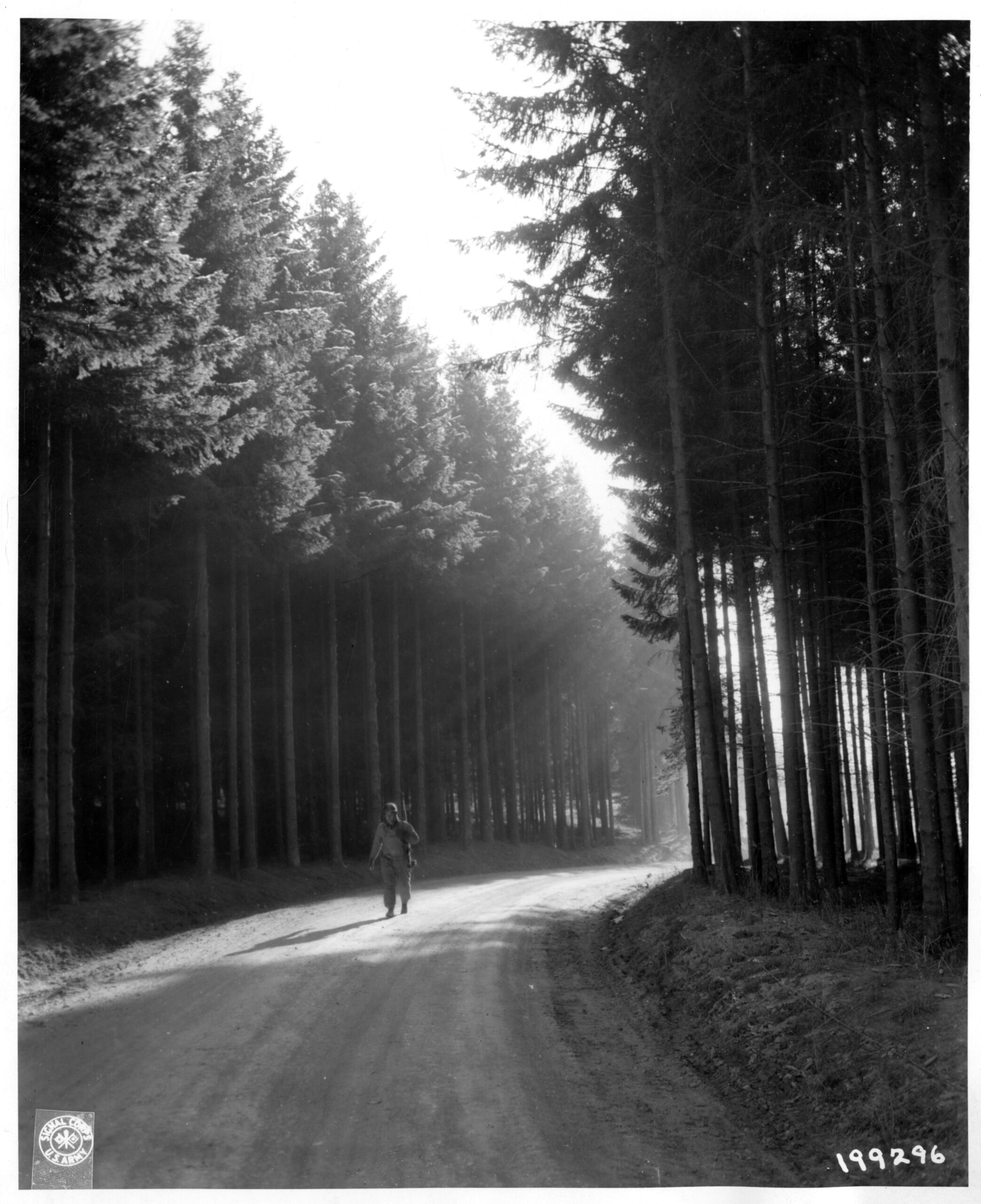 Pfc Margerum, Philadelphia, Pennsylvania, walks the road through a peaceful forest in Belgium, as he returns from the front lines.